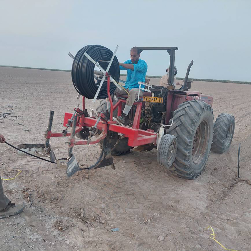 وی در مورد نحوه اجرای این طرح در سطح مزرعه گفت: طرحی که در شرکت کشت و صنعت دعبل خزایی اجرا شد به این صورت است که مزرعه را به دو نیم تقسیم کردیم، در نیمه اول عمق کارگذاری لوله ها ۲۰ سانتی متر و در نیمه دوم ۱۵ سانتی متر اجرا شد، فاصله قطره چکانها برای همه شرکت ها ۵۰ سانتی متر ثابت ماند، این کار با ورود یک مشاور و خریداری وسایل مورد نیاز به اجرا درآمد، در این مرحله نیاز به دستگاهی بود که بتواند لوله ها را در عمق مورد نظر جاگذاری نماید، دستگاه توسط نیروهای شرکت طراحی و ساخته شد، لوله گذاری در یک مزرعه به طول ۱۰۰۰ متر و عرض ۲۵۶ متر شروع شد و ۱۴۳ کیلومتر لوله بکار رفت و مزرعه به ۵۴۰ فارو ( جویچه) تقسیم شد، پس از آن نوبت به لوله های آبرسان رسید، این لوله ها در دو طرفه مزرعه و با سایز ۲۰۰ نصب و به لوله های آبیاری وصل گردید، اما برای حفظ فشار آب در مسیر، هر مزرعه را به ۹ قسمت تقسیم کردیم و سایز لوله ها به ۱۶۰، ۱۴۰ و ۹۰ کاهش دادیم، در طرف دیگر مزرعه یک لوله سایز ۹۰ نصب شد و در هر قطعه یک شیر تخلیه برای شستشو و رسوبزدایی تعبیه گردید، تا از ایجاد گرفتگی در قطره چکانها جلوگیری شود ، لوله های استفاده شده از جنس پلی اتیلن هستند، دبی هر یک از قطره چکانها ۴/۲ لیتر در ساعت و این لوله ها می توانند تا ۴ بار فشار را تحمل کنند.